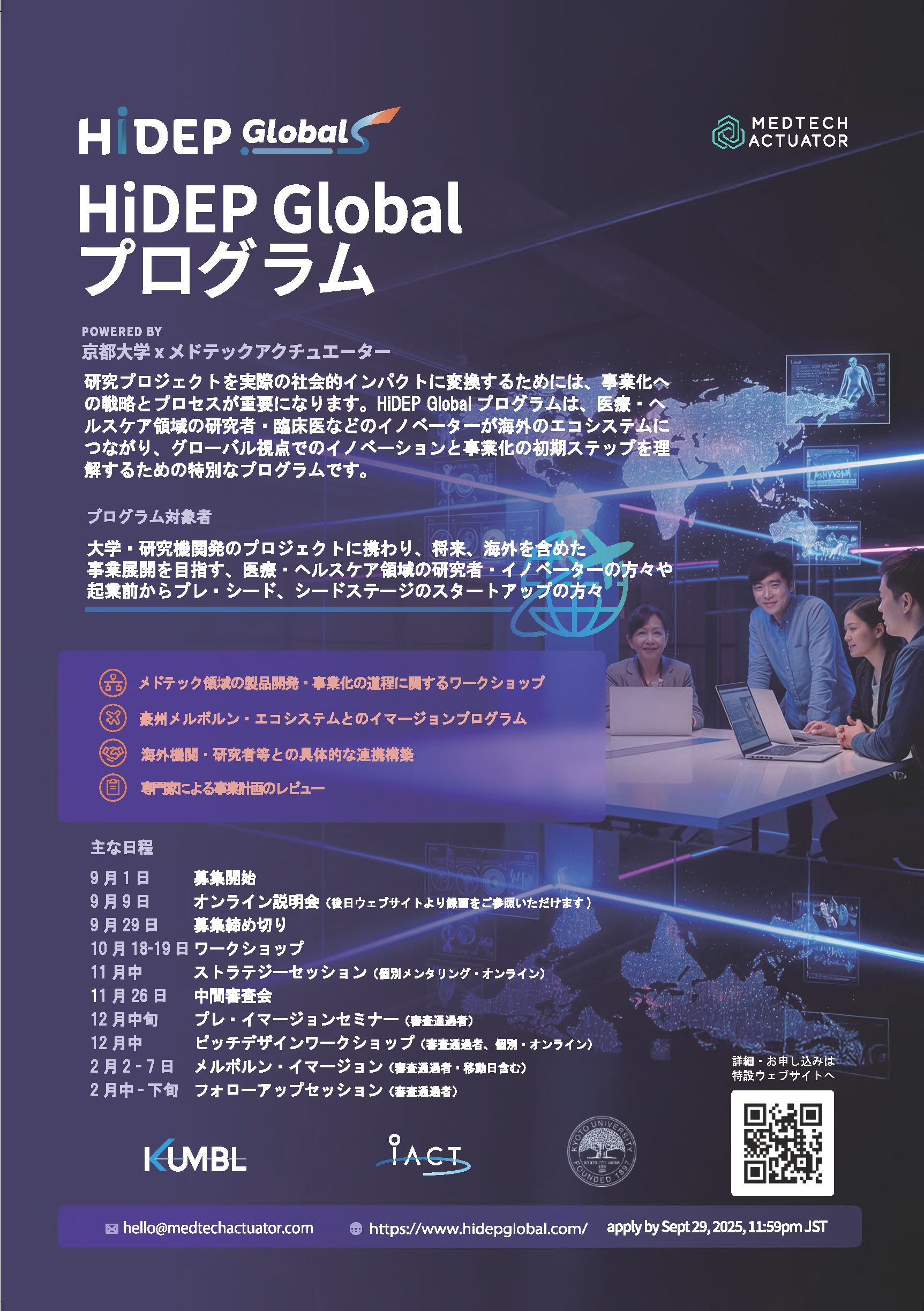 医療機器の国際展開支援および海外ネットワーク構築を目的とした新プログラム「HiDEP Global」を立ち上げました。本プログラムは、豪州メルボルンに拠点を持つスタートアップ支援組織 MedTech Actuator(MTAC)と連携し、医療機器開発の初期段階から海外市場を視野に入れた事業戦略の構築を支援いたします。プログラムは前半のセミナー、後半の海外イマージョンと二部構成となっております。